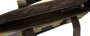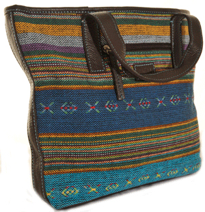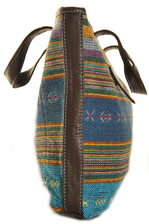 A handheld bag in a striking soft blue/multi colour kilim weave cotton fabric with chocolate brown leather trim.