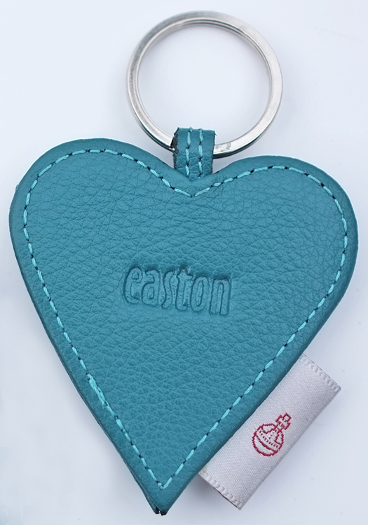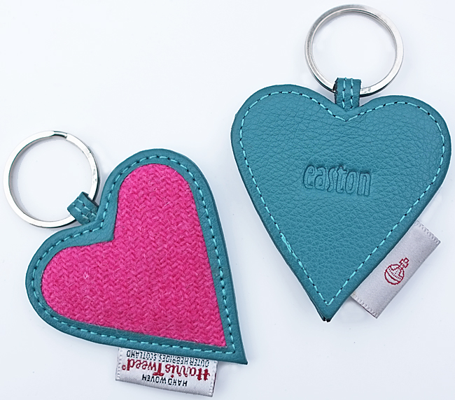 A softly padded Harris tweed and leather keyring in bright pink plain weave Harris tweed with teal leather trim.